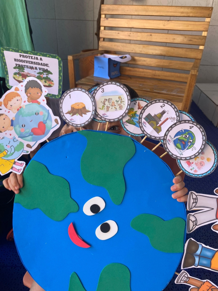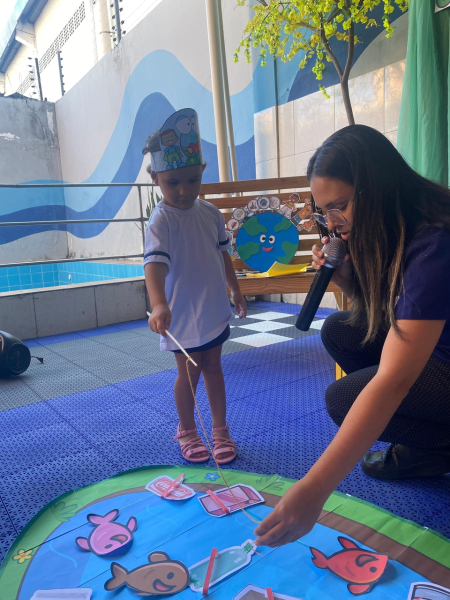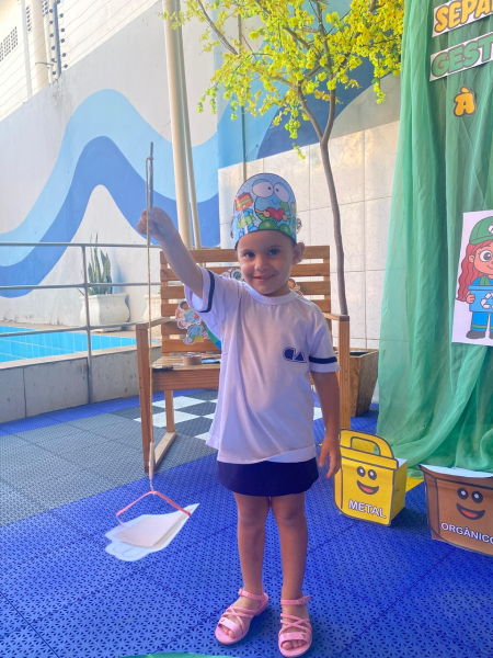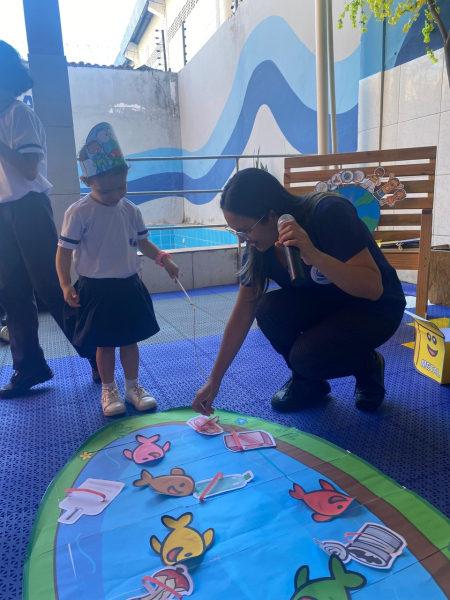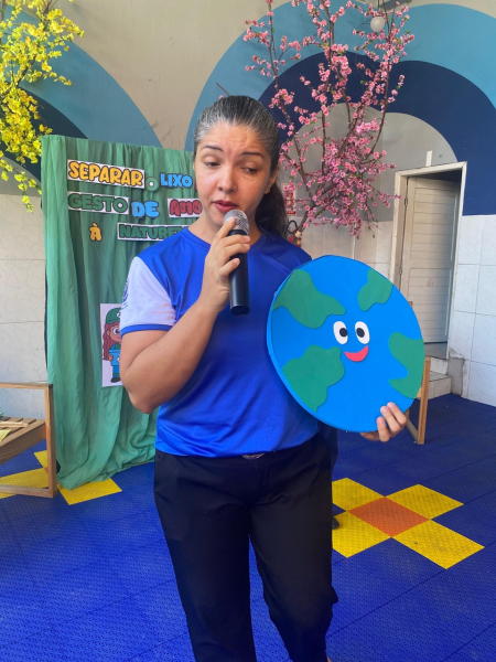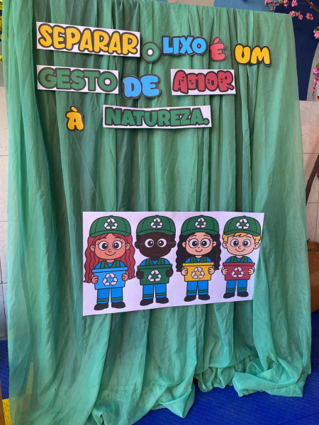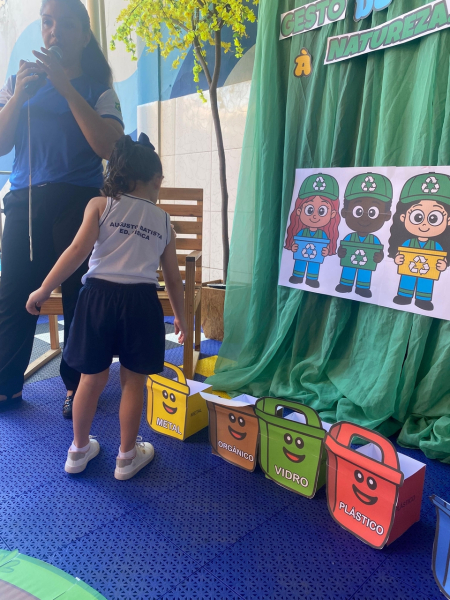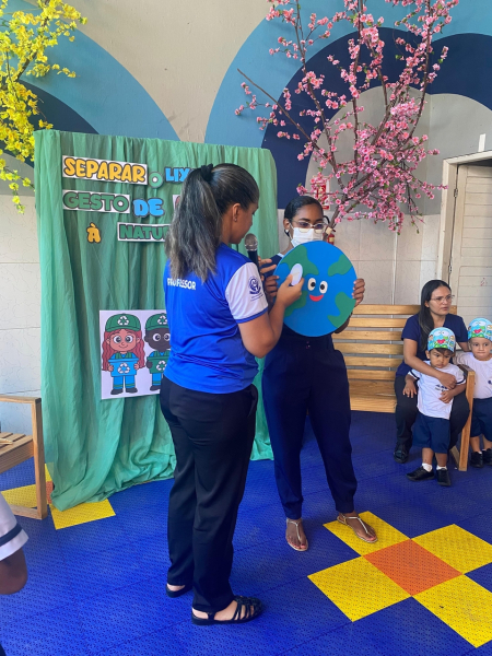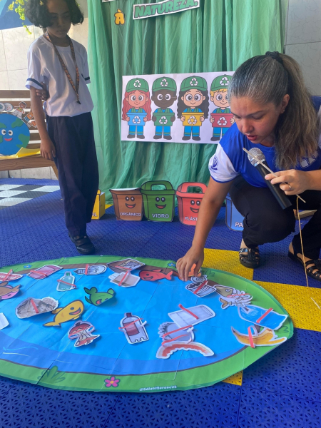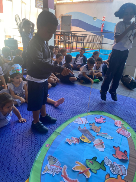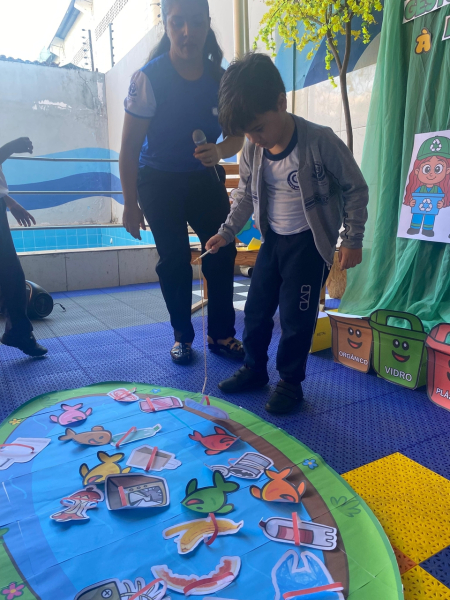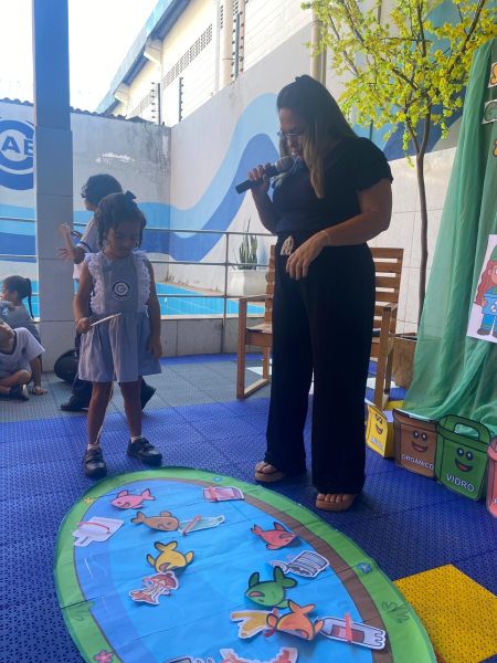 Houve contação de história explicando de forma lúdica sobre a importância de preservar o meio ambiente. Bem como uma dinâmica interativa em que as crianças pescavam o lixo que estava "poluindo o rio" e depois os despejaram nas lixeiras que correspondiam ao material de cada um.